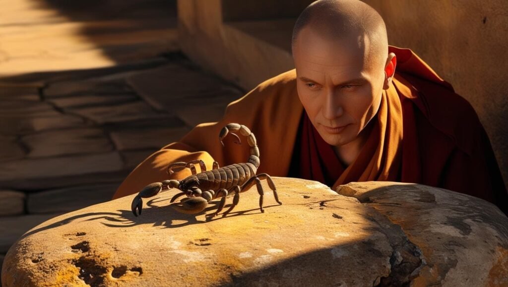 Monge e discípulos iam por uma estrada e, quando passavam por uma ponte, viram um escorpião sendo arrastado pelas águas.